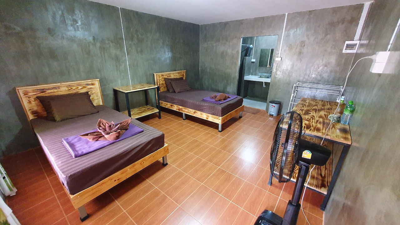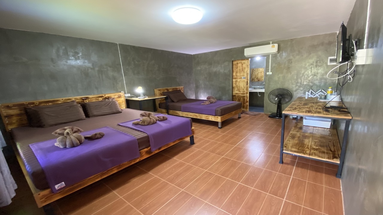ห้องพักติดแอร์ในอาคารขนาด 5x6.5 เมตร ให้พื้นที่ส่วนตัวรวมห้องน้ำ 30 ตร.ม. สำหรับพัก 4 ท่าน มีเตียงใหญ่คิงส์ไซส์ 2 เตียง ห้องละ 1,800 บาท/คืน รวมอาหารเช้า สำหรับ 4 ท่านAir-con Studio Quadruple Room size 5x6.5 m. with the total private area including bathroom 30 sq.m. Suite for 4 people. Composed of 2 King-sized bed. Price 1,800 Baht/Night. Breakfast included for 4 people.